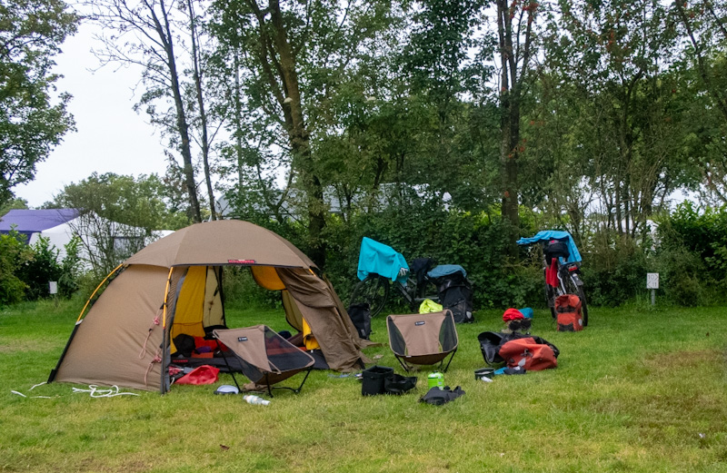 Als we de tent uitkomen is het weliswaar bewolkt, maar wel droog. Dat is al beter dan de verwachting van de buienradar.